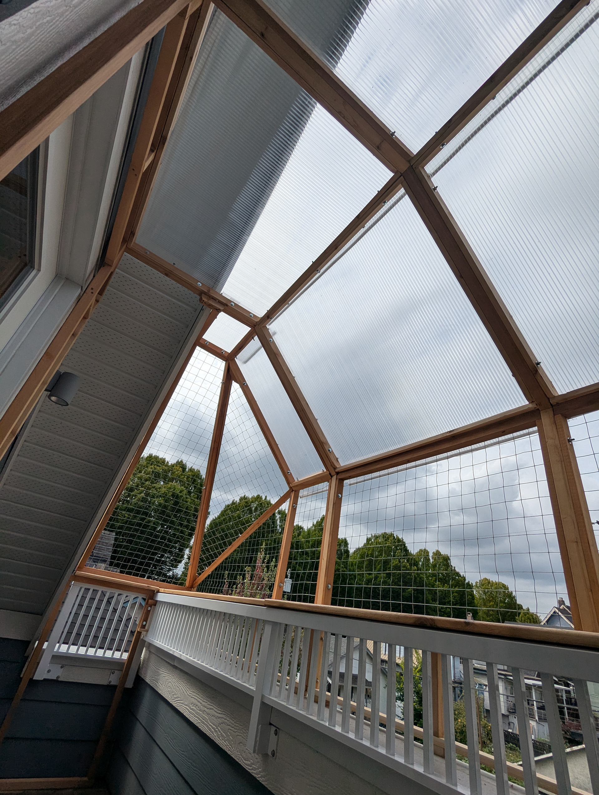Gwen and Gus's humans contacted me to build their bosses a catio on a disused upper balcony. This one was interesting because they wanted the shape to blend in with their building.